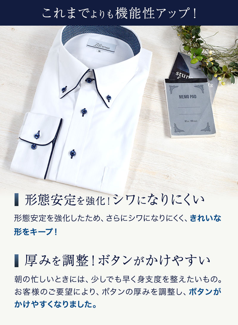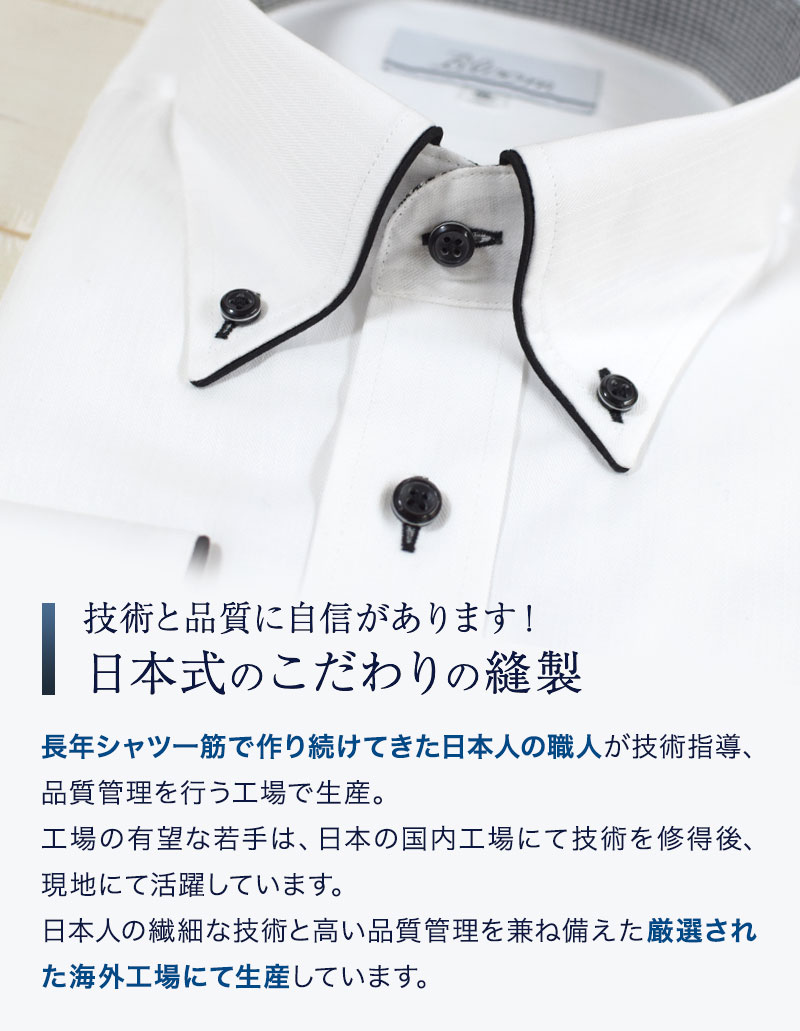 Sから6LのBLOOMオリジナルの長袖ワイシャツ 素材:綿50% ポリエステル50% 今回の生産する縫製工場は、長年シャツ一筋で作り続けてきた日本人の職人が 常時工場に常駐し技術指導および技術継承、品質管理を行っております。 そのような、日本人の繊細な技術と高い品質管理を兼ね備えた 厳選された海外工場にて生産している一品ですので 是非お試し下さい!